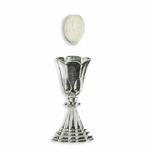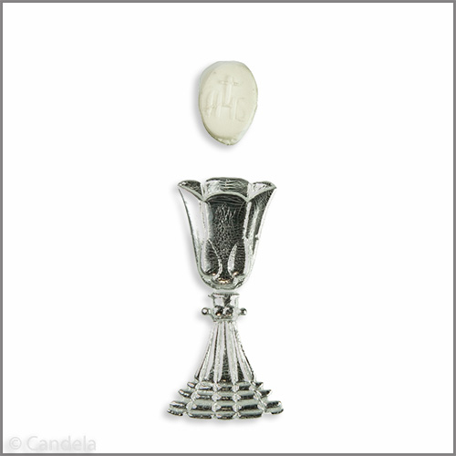 Kommunionkerzen Wachsmotiv Kelch mit weißer Hostie silber