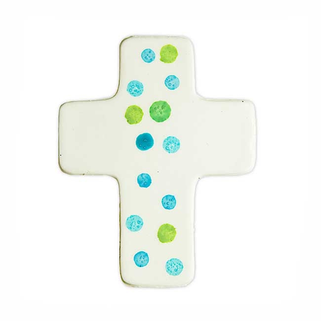 Kommunionkerzen Wachsmotiv Weißes Kreuz mit türkis-grünen Tupfern